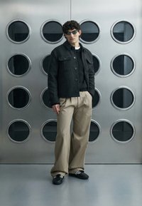 Νέος άνδρας με γυαλιά ηλίου, γκρι ζακέτα με φερμουάρ και μαύρο φαρδύ παντελόνι στέκεται με τα χέρια στις τσέπες μπροστά σε υφή πέτρινης γεωμετρικής τοιχοποιίας.