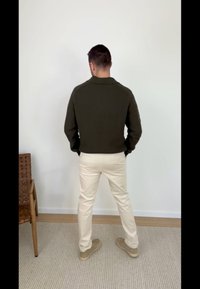 • Άνδρας που φοράει ελιάς πράσινο ζακάρ πουλόβερ πάνω από άσπρο πουκάμισο, παντελόνι εκρού και μπεζ παπούτσια, στέκεται πάνω σε ένα υφασμάτινο χαλί με υφή.