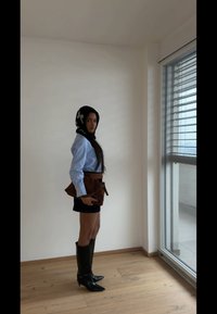 • Νεαρή γυναίκα που φοράει μαύρο μαντήλι με σχέδια, ριγέ μπλε πουκάμισο, μαύρη φούστα, καφέ ζώνη, κρατώντας καφέ τσάντα, στέκεται μέσα σε κτίριο κοντά σε παράθυρο.
