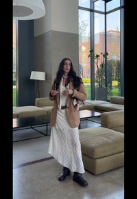 • Καφέ κομψό σακάκι πάνω από ένα λευκό υφασμάτινο φόρεμα με δαντέλα, φορώντας μαύρες μπότες μέχρι τον αστράγαλο. Χέρι διακοσμημένο με πολλές βέρες.
