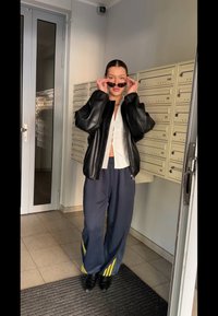 • Γυναίκα με γ�υαλιά ηλίου, φορώντας μαύρο δερμάτινο μπουφάν, λευκό πουκάμισο και ναυτικό μπλε παντελόνι με κίτρινες ρίγες, στέκεται δίπλα σε μπεζ θυρίδες ταχυδρομείου σε εσωτερικό χώρο.