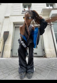 • Μαύρο αθλητικό μπουφάν με άσπρες ρίγες πάνω από μπλε μπλούζα, χαλαρές μαύρες παντελόνες και χοντρές μαύρες παπούτσια. Το φόν�το περιλαμβάνει μια γκρι πόρτα γκαράζ.