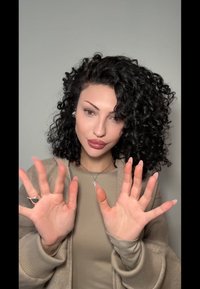 • Σγουρά σκούρα μαλλιά, προφίλ από το πλάι. Φοράει ένα μπεζ μπουφάν με φερμουάρ και ένα ανοιχτόχρωμο μπλουζάκι. Ξεχωριστό ασημένιο σκουλαρίκι. Μαλακό μακιγιάζ με γατίσια γραμμή eyeliner.