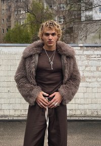 • Νεαρό άτομο με ξανθά σγουρά μαλλιά που φοράει καφέ μπουφάν από ψεύτικη γούνα, σκούρο καφέ ρούχο, ασημένιο κολιέ με κλειδί και πολλά δαχτυλίδια, στέκεται σε εξωτερικό χώρο.