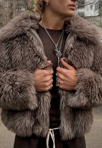 • Άτομο που φοράει παχιά γκρι ψεύτικη γούνα, πολλούς ασημένιους δαχτυλίδια και μακρύ ασημένιο κρεμαστό με κλειδί, στέκεται έξω σε αστικό χώρο.