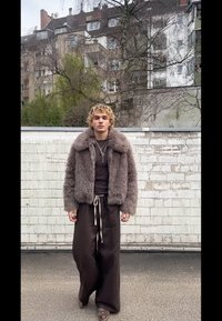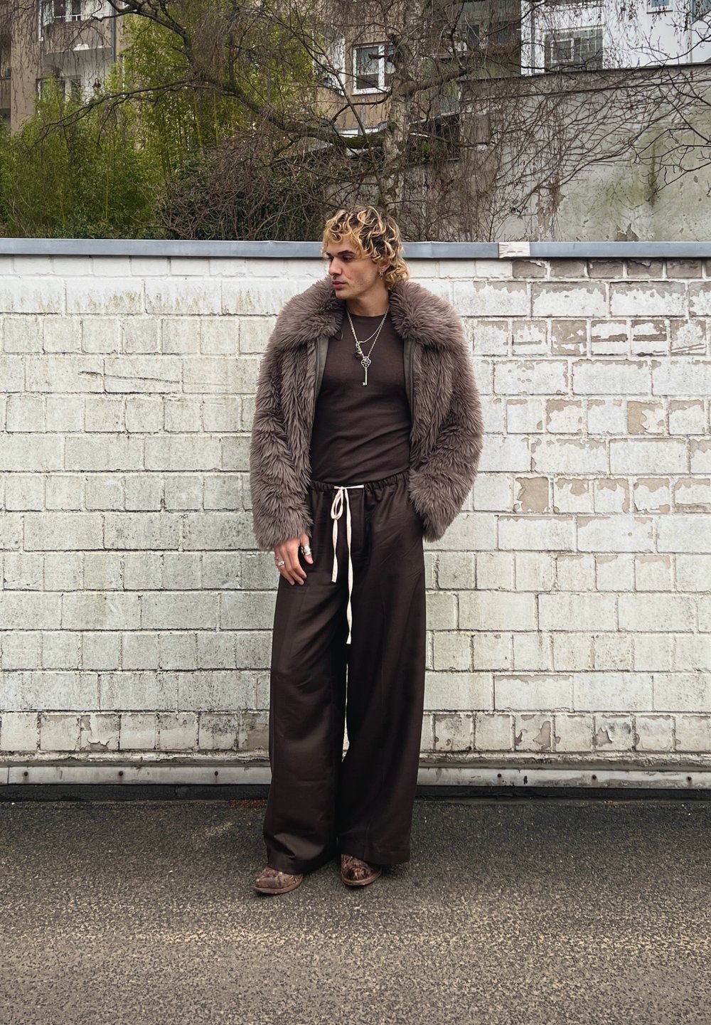 • Άτομο με σγουρά ξανθά μαλλιά, ντυμένο με καφέ faux γούνινο μπουφάν, σκούρα καφέ παντελόνια φαρδιά με λευκό κορδόνι και στρωματοποιημένα κολιέ, στέκεται σε εξωτερικό χώρο.
