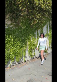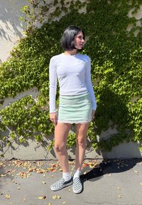• Γυναίκα με κοντά μαύρα μαλλιά, φορώντας λευκή μπλούζα με μακριά μανίκια, φούστα σε μέντα πράσινο χρώμα και καρό παπούτσια slip-on, στέκεται δίπλα σε έναν εξωτερικό τοίχο καλυμμένο με κληματίδα.