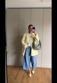 • Υπερμεγέθης κίτρινος σακάκι, λευκή αμάνικη μπλούζα και ανοιχτό μπλε τζιν. Κρατάει μια υφασμάτινη τσάντα σε ελιά. Το φόντο περιλαμβάνει έναν τοίχο από τού�βλα.