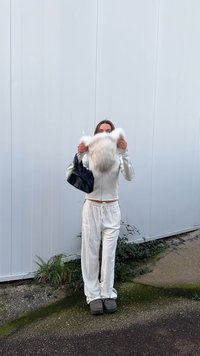 • Άτομο που φοράει λευκό παντελόνι φόρμας Adidas και λευκό μπουφάν, κρατώντας μια αφράτη λευκή τσάντα, στέκεται έξω σε σκυρόδεμα.