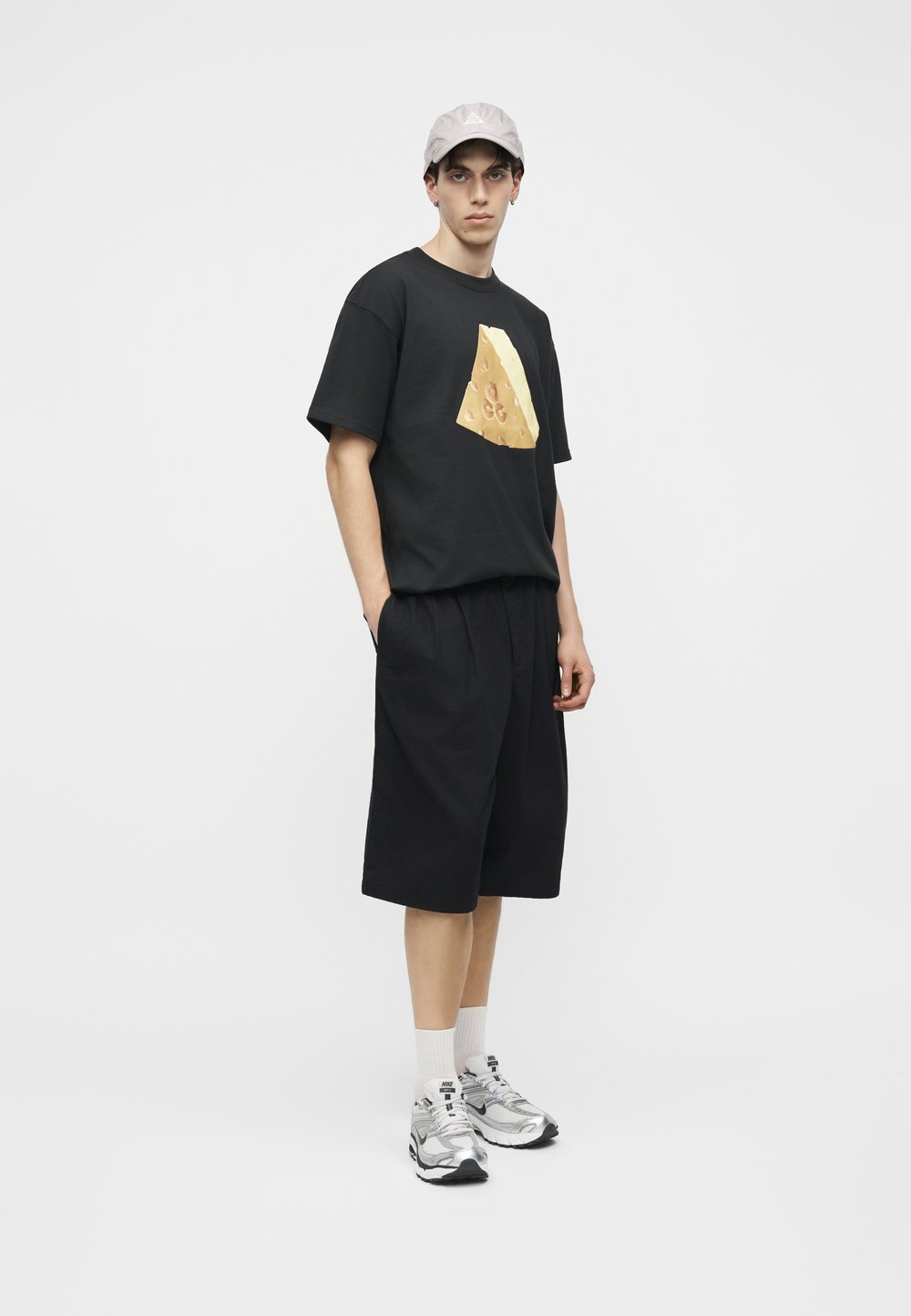 Νέος άνδρας με υπερμεγέθη σκούρα φούτερ με κουκούλα, μαύρα σορτς και μαύρα μποτάκια, στέκεται με τα χέρια στις τσέπες μπροστά σε μεγάλα μπλε διπλά πόρτα.