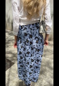 • Γαλάζια φλοράλ φούστα με μαύρα και πορτοκαλί λουλούδια, με κουμπιά μπροστά και τσέπες, σε συνδυασμό με λευκά ανοιχτά σανδάλια.