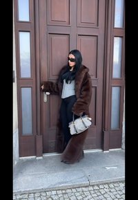Ψεύτικο παλτό γούνας σε καφέ αποχρώσεις, μαύρη μπλούζα, χαλαρές μαύρες τζιν, καφέ τσάντα και καφέ μπότες. Αστικό τοπίο με δέντρα και αυτοκίνητα στο φόντο.