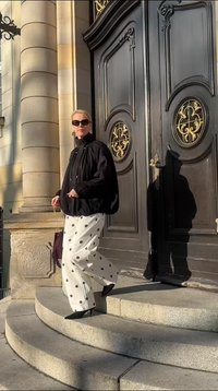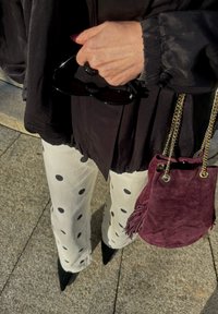 • Άτομο που φοράει λευκό παντελόνι με μαύρες πουά, μαύρα μυτερά παπούτσια, μαύρο σακάκι, κρατώντας μαύρα γυαλιά ηλίου και μια μπορντό σουέντ τσάντα με χρυσές αλυσίδες.