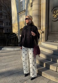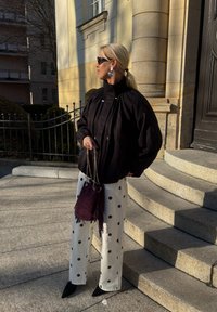 • Γυναίκα με ξανθά μαλλιά, μαύρο μπουφάν, λευκό παντελόνι με πουά, μαύρα παπούτσια και γυαλιά ηλίου, κρατώντας μια μωβ τσάντα, στέκεται σε πέτρινα σκαλοπάτια σε εξωτερικό χώρο.