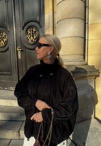 • Ξανθιά γυναίκα με μαύρο υπερμεγέθη σακάκι και γυαλιά ηλίου στέκεται δίπλα σε περίτεχνη ξύλινη πόρτα και πέτρινη κολόνα, κρατώντας τσάντα με αλυσίδα στον ήλιο.