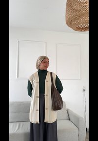 • Γυναίκα με εμπριμέ μαντήλι στο κεφάλι και μπεζ γιλέκο κάθεται σε ένα ανοιχτό γκρι καναπέ, κρατώντας μια μεγάλη καφετί δερμάτινη τσάντα σε έναν μινιμαλιστικό χώρο.