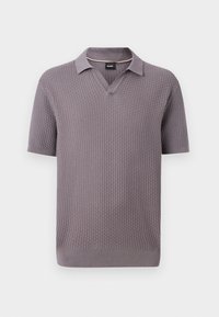 • Μπεζ πλεκτό πουκάμισο πόλο με κοντά μανίκια, φορεμένο πάνω από λευκό μπλουζάκι, συνδυασμένο με φαρδιά σκούρα γκρι τζιν και μαύρα παπούτσια. Πράσινη φυλλωσιά στο φόντο.