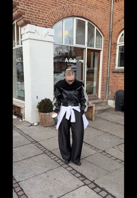 Μαύρο δερμάτινο μπουφάν μοτοσικλετιστή πάνω από γκρι κάρντιγκαν και λευκή μπλούζα, συνδυασμένο με φαρδιά μαύρα παντελόνια και μαύρα υποδήματα, κρατώντας μια μαύρη τσάντα.