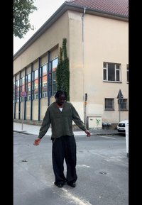 • Υπερμεγέθης ελαιώδης πράσινη πλεκτή κάρντιγκαν με υφασμάτινη επιφάνεια και ξύλινους κουμπιά, συνδυασμένη με πλατιά μαύρη-άσπρη ριγέ παντελόνι και μαύρα παπούτσια.