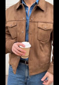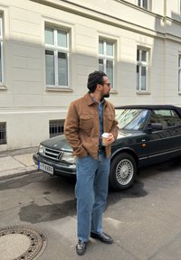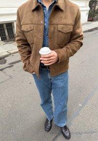 • Άτομο που φοράει καφέ καμπαρντίνα σουέτ, μπλε τζην πουκάμισο, μπλε τζιν παντελόνι και μαύρα παπούτσια κρατώντας ένα λευκό χάρτινο ποτήρι καφέ σε πεζοδρόμιο στην πόλη.