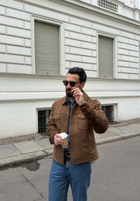 • Άνδρας με σκούρα μαλλιά και γένια που φοράει γυαλιά ηλίου, καφέ μπουφάν και μπλε τζιν, κρατώντας ένα ποτήρι καφέ για πακέτο σε πεζοδρόμιο της πόλης.