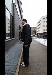 • Άνδρας ντυμένος με μαύρο μπουφάν με γιακά από γούνα, πράσινο πουκάμισο με φερμουάρ, μαύρο φαρδύ παντελόνι και μαύρα-λευκά αθλητικά παπούτσια που στέκεται σε αστικό πεζοδρόμιο.