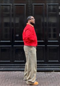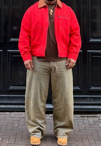 • Άνδρας με κόκκινο μπουφάν, καφέ πουκάμισο, φαρδιά μπεζ παντελόνια, καφέ μπότες και χρυσά κολιέ, στέκεται σε πλακόστρωτο πεζοδρόμιο μπροστά από μια μαύρη πόρτα.