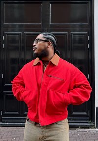 • Άνδρας με πλεξούδες, φοράει μαύρα γυαλιά και κόκκινο μπουφάν με καφέ γιακά, στέκεται με τα χέρια στις τσέπες μπροστά από μαύρη πόρτα.