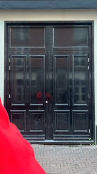 • Άνδρας με πλεγμένα μαλλιά και γυαλιά ρυθμίζει το κόκκινο μπουφάν του, στέκεται μπροστά σε μεγάλες μαύρες πόρτες με πάνελ, σε λιθόστρωτο δρόμο.