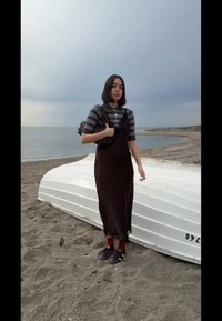 • Νεαρή γυναίκα με ριγέ πουκάμισο και καφέ φόρεμα κάθεται σε αναποδογυρισμένη λευκή βάρκα σε βοτσαλωτή παραλία δίπλα σε ήρεμη θάλασσα, κρατώντας καφέ τσάντα.