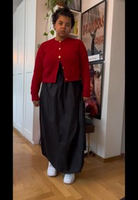 • Κόκκινο ριγέ κασκόλ με χρυσά κουμπιά πάνω από μια ροή μαύρη μακριά φόρεμα, συνδυασμένο με άσπρα αθλητικά παπούτσια, σε ένα καλά φωτισμένο εσωτερικό χώρο.