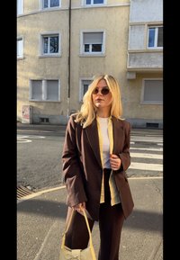 • Νέα γυναίκα με καφέ κοστούμι και κίτρινη τσάντα βρίσκεται σε διάβαση πεζών, με τον ήλιο να φωτίζει το πρόσωπό της, τα μάτια κλειστά, κοντά σε ένα μπεζ κτίριο με παράθυρα.
