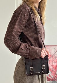 • Άτομο που φοράει καφέ πουκάμισο με ρίγες και παντελόνι από τουίντ, κρατώντας μια μαύρη δερμάτινη τσάντα Dr. Martens ώμου.