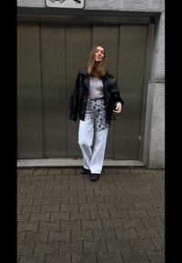• Γυναίκα που στέκεται σε πεζοδρόμιο μπροστά από μια μεταλλική πόρτα, φορώντας μαύρο δερμάτινο μπουφάν, λευκό πουκάμισο, λευκό παντελόνι με μαύρο λουλουδάτο σχέδιο και μαύρα παπούτσια.