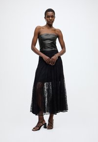 Μαύρο strapless maxi φόρεμα με φουσκωτή μέση, συνδυασμένο με μια μικρή μαύρη τσάντα και αξεσουάρ. Λεπτό υφή, ομοιόχρωμο, κομψή σιλουέτα.