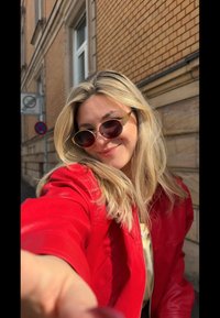 • Ξανθιά γυναίκα με κόκκινο μπουφάν και γκρι παντελόνι κρατά γυαλιά ηλίου δίπλα σε τούβλινο κτίριο κοντά σε πινακίδα στάσης και φανάρι σε αστική οδό.