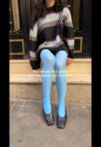 • Άτομο που φοράει πουλόβερ με ρίγες και χνουδωτή υφή, μαύρη φούστα, φωτεινές μπλε κάλτσες, μαύρα παπούτσια με τετράγωνη μύτη και γυαλιά ηλίου, στέκεται σε πεζοδρόμιο πόλης.