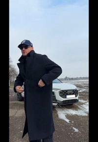 • Άνδρας με σκούρο παλτό, δερμάτινα γάντια, γυαλιά ηλίου και καπέλο μπέιζμπολ στέκεται στο χιονισμένο δρόμο με ένα λευκό αυτοκίνητο και γυμνά δέντρα πίσω του.