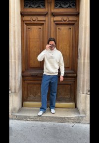 • Μπεζ φούτερ με λογότυπο "Ford Mustang", μπλε τζιν και γκρι αθλητικά παπούτσια. Άνδρας στέκεται μπροστά σε ξύρινες πόρτες με διακοσμητικές λεπτομέρειες.