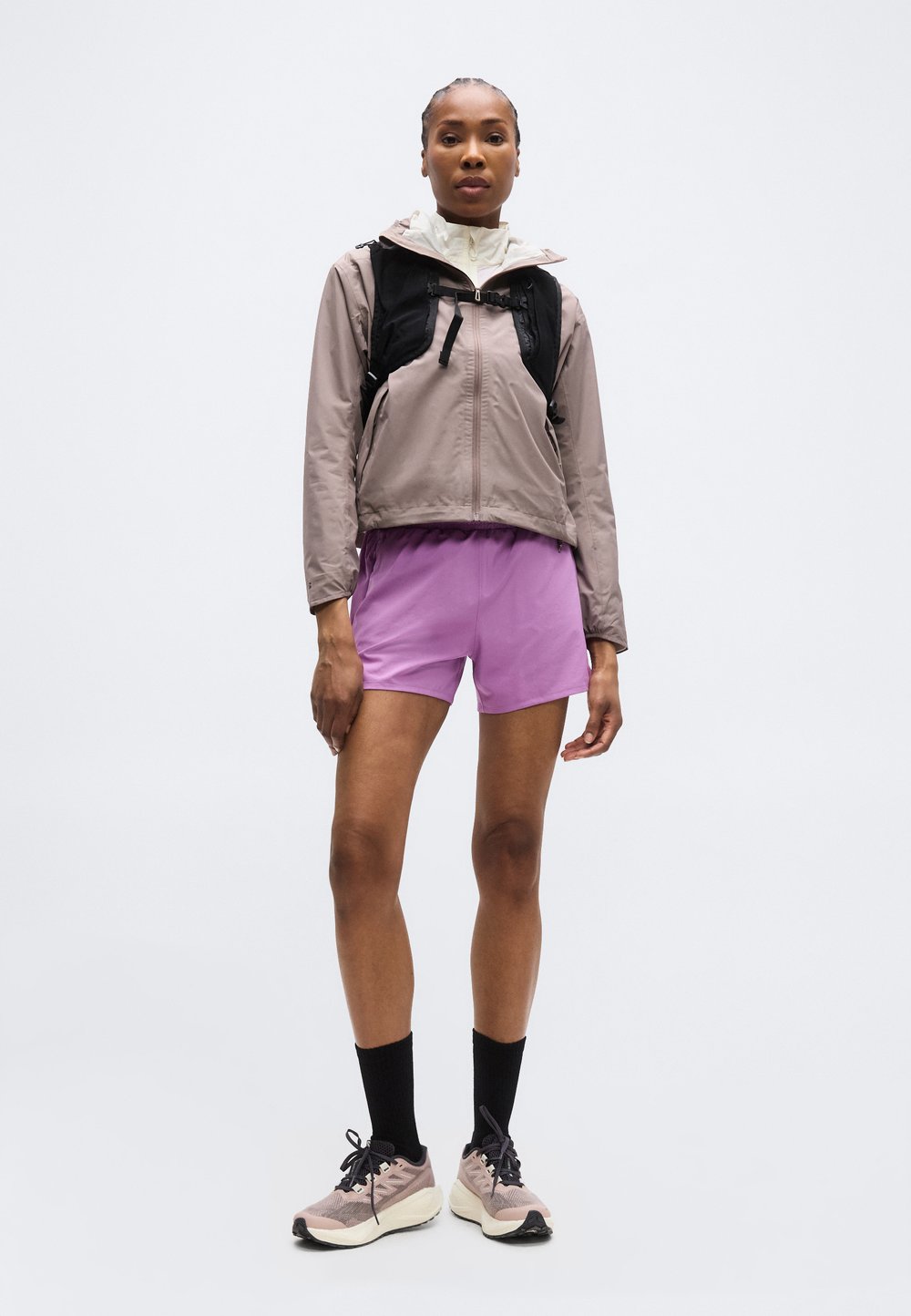 Γυναίκα δρομέας με λευκή κοντή μπλούζα, μαύρες βερμούδες και πορτοκαλί μανίκια. Φοράει μαύρα γυαλιά ηλίου και πορτοκαλί αθλητικά παπούτσια.