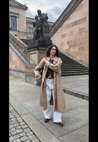 • Μπεζ παλτό πάνω από καφέ κάρντιγκαν, λευκά παντελόνια με φαρδιά πόδια και καφέ παπούτσια με μπορντό λεπτομέρειες. Μαύρη τσάντα στο χέρι.