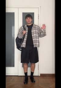 • Νεαρός άνδρας στέκεται μπροστά από μια μεγάλη ξύλινη πόρτα, φοράει πουκάμισο καρό, μαύρες βερμούδες, μαύρα παπούτσια και κρατάει τσάντα ώμου.