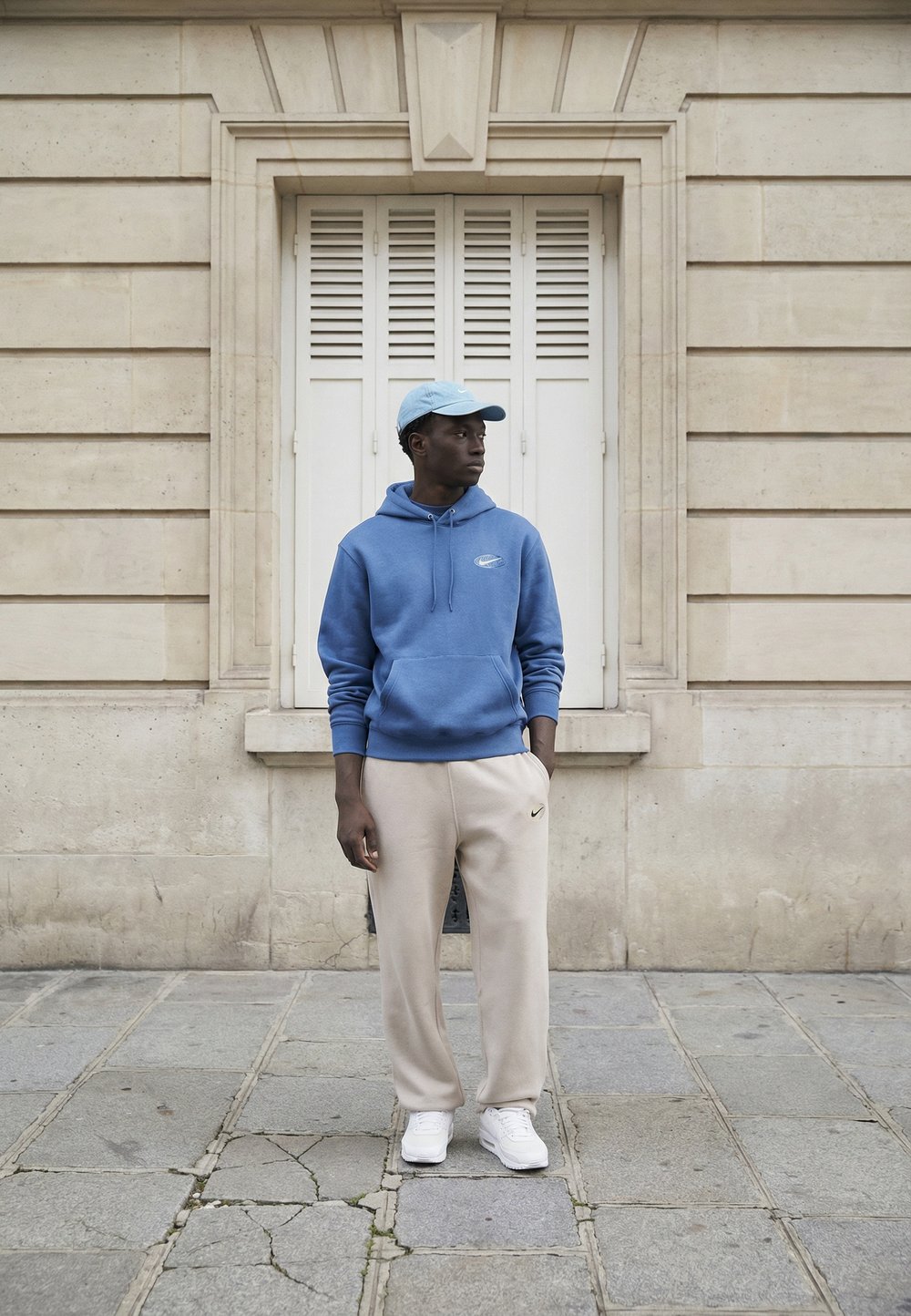 Ανοιχτό μπλε φούτερ με κοντά μανίκια και μπροστινή τσέπη, μαύρο φαρδύ παντελόνι και μπλε αθλητικά παπούτσια με λευκές ρίγες. Φοράει μαύρο καπέλο και γυαλιά ηλίου.