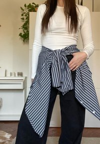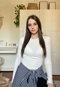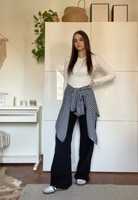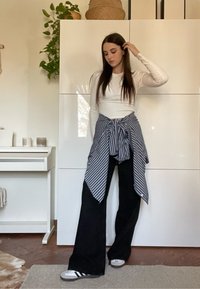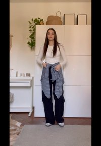 • Νεαρή γυναίκα με λευκό μακρυμάνικο τοπ, μαύρο παντελόνι φαρδύ στο πόδι, ριγέ πουκάμισο δεμένο γύρω από τη μέση, στέκεται σε ένα φωτεινό δωμάτιο με φυτά και έπιπλα.