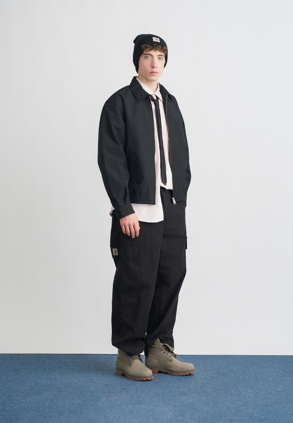 Άτομο που φοράει μαύρο σακάκι, φαρδιά μαύρη παντελόνα και μπότες, στέκεται πλευρικά δίπλα σε μια υφής λευκή τοίχο και μια μεγάλη καφέ ξύλινη πόρτα.