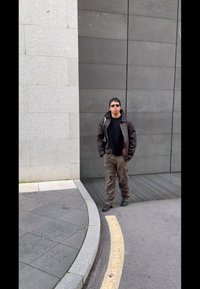 • Καφέ δερμάτινο μπουφάν, μαύρος υφασμάτινος φούτερ, ελαιοπράσινα cargo παντελόνια, μαύρες μπότες και γυαλιά ηλίου, περπατούν μπροστά σε γκρι πέτρινο φόντο.