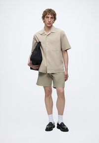 Κοντομάνικο καφέ πουκάμισο με σχέδιο, σκούρο παντελόνι, μαύρα παπούτσια, με αξεσουάρ όπως βραχιόλια και ένα κολιέ. Αστικό φόντο.