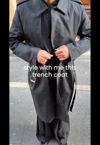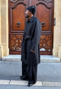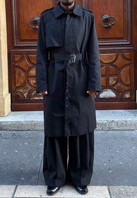 • Άνδρας που στέκεται μπροστά από μια ξυλόγλυπτη πόρτα, φορώντας μαύρο παλτό με ζώνη, φαρδιά μαύρα παντελόνια και μαύρα παπούτσια.