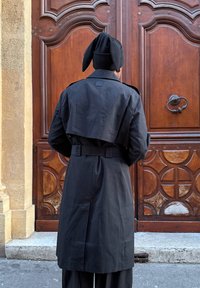 • Άνδρας στέκεται μπροστά σε ξύλινη πόρτα φορώντας μακρύ μαύρο παλτό με ζώνη, φαρδιά μαύρη παντελόνια, μαύρα παπούτσια και μαύρο μαντήλι στο κεφάλι με φιόγκο.