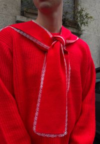 • Άτομο που φοράει φωτεινό κόκκινο ριμπ πλεκτό πουλόβερ και αντίστοιχο κόκκινο κασκόλ με λευκή δαντέλα στη φάσα, δεμένο γύρω από το λαιμό σε εξωτερικό χώρο.